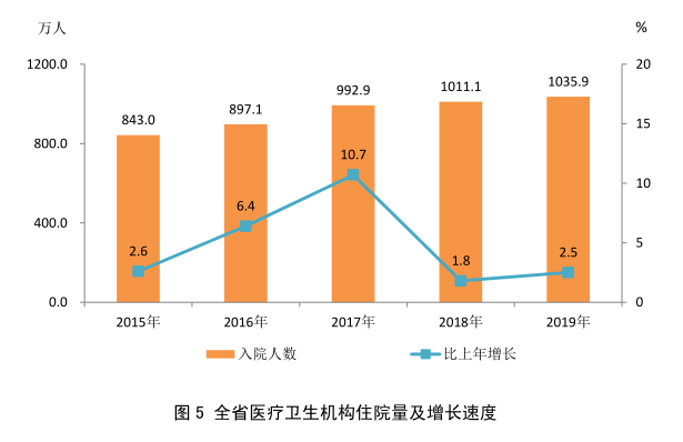 2019年,全省医疗卫生机构入院人数1035.9万人,比上年增加24.8万人(增长2.5%),年住院率为16.25%。