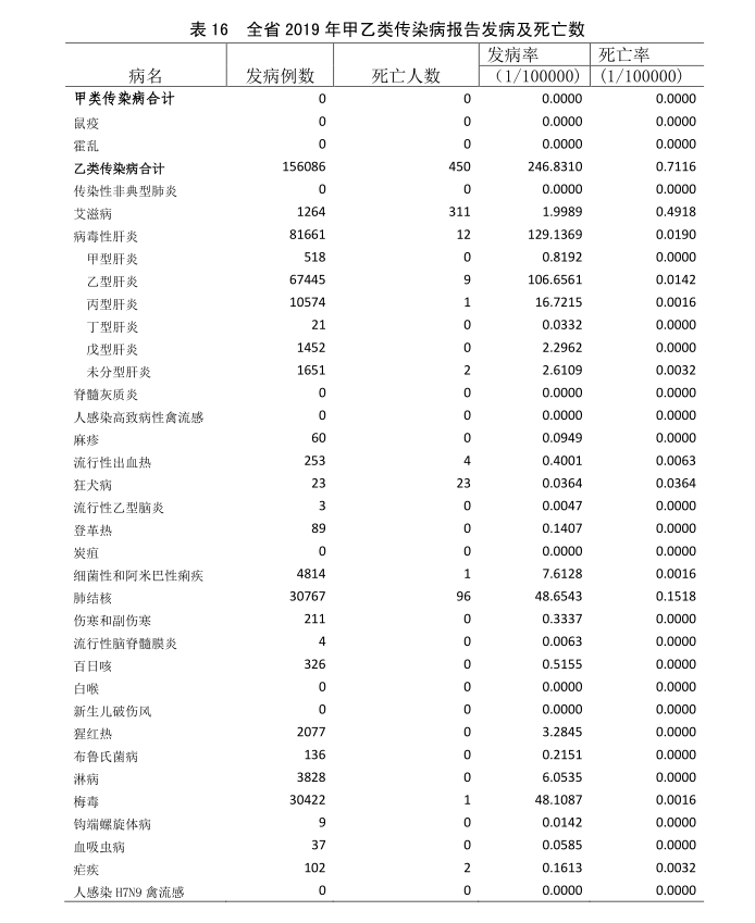 疫情按类别统计:无甲类传染病报告。乙类传染病除新生儿破伤风、炭疽、人感染致病性禽流感、人感染H7N9禽流感、脊髓灰质炎、传染性非典型费用、白喉7种无发病、死亡报告外,其他19种共报告发病156086例,死亡450人;报告发病率为246.8310/10万,较2018年上升8.29%;报告死亡率为0.7116/10万,较2018年上升8.56%。报告发病数居前5位的病种依次为病毒性肝炎、肺结核、梅毒、细菌性和阿米巴性痢疾、淋病,占乙类传染病报告发病总数的97.06%;报告死亡数居前3位的病种依次为艾滋病、肺结核、狂犬病,占乙类传染病报告死亡总数的95.56%(见表16)。