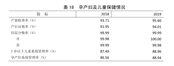 (一)妇幼保健。2019年,孕产妇产前检查率95.66%,产后访视率94.01 %。2019年住院分娩率为99.99%(市100.00%,县99.98%),与上年持平。