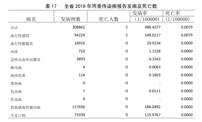 (一)传染病报告发病和死亡。2019年,全省共报告法定报告传染病发病464948例,死亡455人,报告发病率为735.2587/10万,报告死亡率为0.7195/10万。