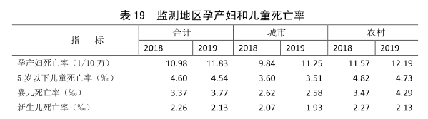 (二)5岁以下儿童死亡率。据妇幼卫生监测,2019年,5岁以下儿童4.54‰,其中:城市3.51‰, 农村4.73‰;婴儿死亡率3.77‰,其中:城市2.58‰, 农村4.29‰。与上年相比,5岁以下儿童死亡率略有下降、婴儿死亡率上升(见表19)。