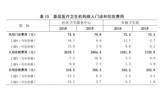 (二)基层医疗卫生机构病人医药费用。2019年,社区卫生服务中心次均门诊费用79.8元,按当年价格比上年上涨6.6%,按可比价格上涨3.8%;人均住院费用2964.4元,按当年价格上涨10.6%,按可比价格上涨7.7%(见表15)。