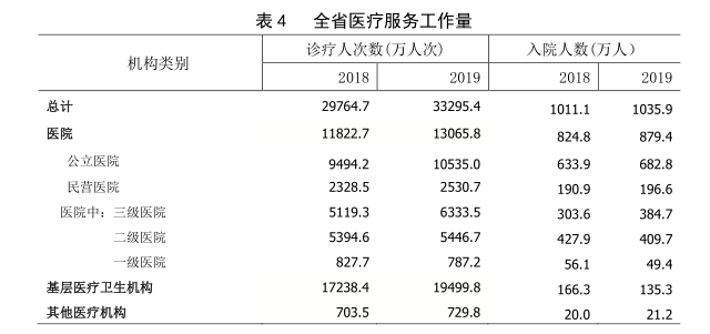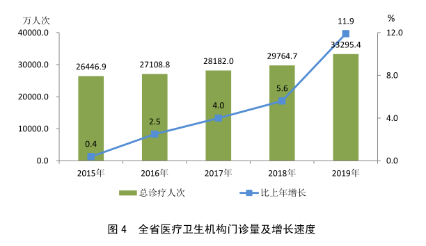 (一)门诊和住院量。2019年,全省医疗卫生机构总诊疗人次(含村卫生室)达33295.4万人次,比上年增加3530.7万人次(增长11.9%)。2019年全省居民到医疗卫生机构平均就诊5.2次。