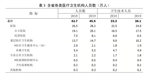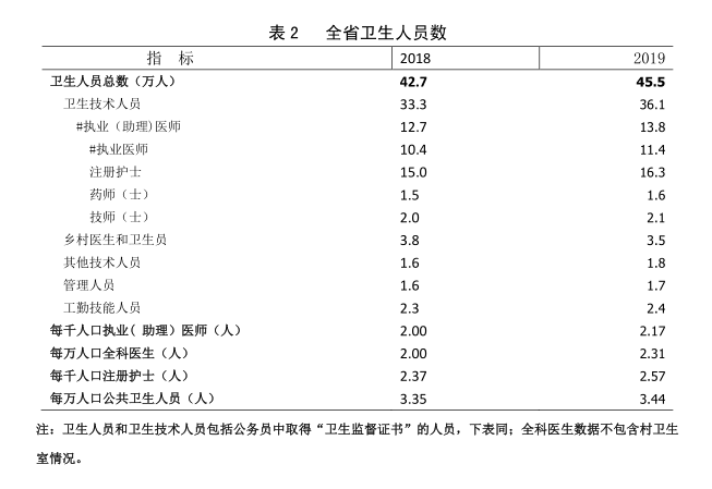 (三)卫生人员总数。2019年末,全省卫生人员总数达45.5万人,比上年增加2.8万人(增长6.5%)。