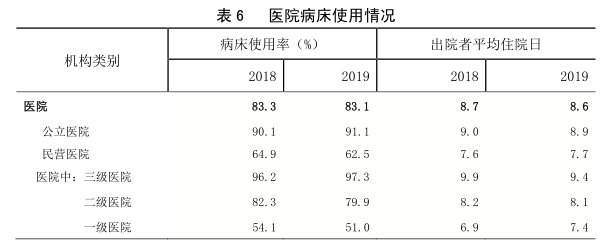 (三)病床使用。2019年,全省医院病床使用率83.1%,其中:公立医院91.1%。与上年比较,医院病床使用率下降0.2个百分点(其中:公立医院上升1.0个百分点)。2019年医院出院者平均住院日为8.6日(其中:公立医院8.9日),医院出院者平均住院日比上年略有下降(见表6)。