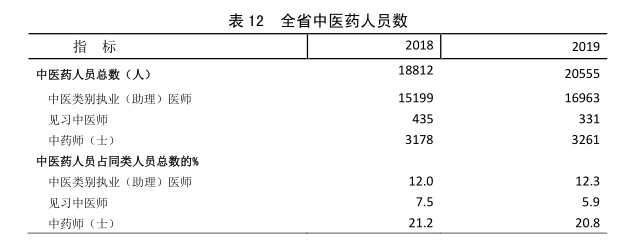 2019年末,全省中医药人员总数达20555人,比上年增加1743人(增长9.27%)。其中:中医类别执业(助理)医师16963人,中药师(士)3261人。两类人员较上年有所增加(见表12)。