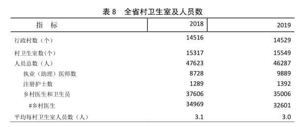 2019年底,全省共14529个行政村共设15549个村卫生室。村卫生室人员达46287人,其中:执业(助理)医师9889人、注册护士1392人、乡村医生和卫生员35006人。平均每村卫生室人员3.0人。与上年比较,村卫生室增加232个,人员总数减少1336人 (见表8) 。