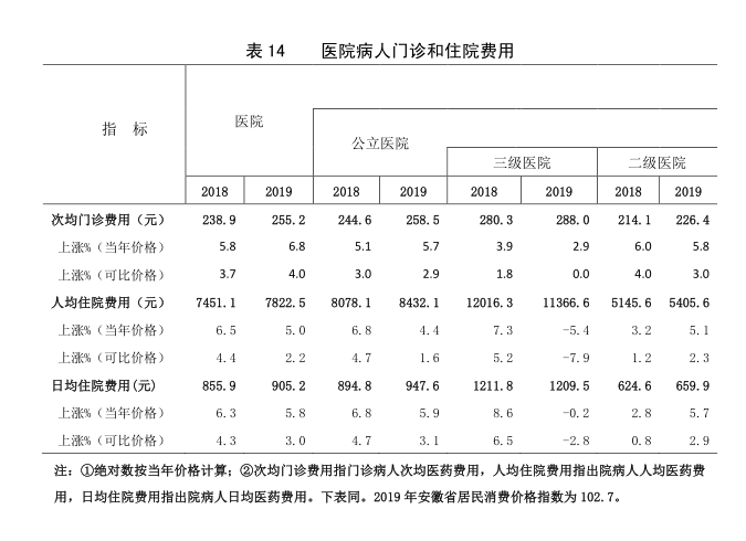 2019年各级公立医院中,三级医院按当年价格次均门诊费用上涨2.9%,人均住院费用按当年价格下降5.4%(见表14)。