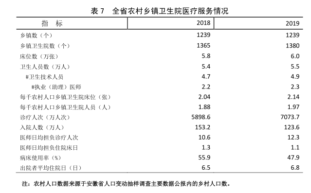 2019年,全省乡镇卫生院诊疗人次达7073.7万人次,比上年增加1175.1万人次;入院人数123 .6万人,比上年减少29.6万人。2019年,乡镇卫生院医师日均担负诊疗12.3人次和住院1.1床日。病床使用率47.9%,出院者平均住院日6.8日。与上年相比,乡镇卫生院医师门诊工作负荷上升,住院负荷下降,病床使用率下降。