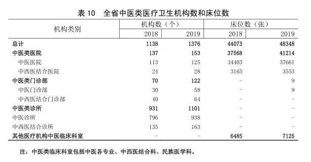 (一)中医类机构、床位及人员数。2019年末,全省中医类医疗卫生机构总数达1376个,比上年增加238个。其中:中医类医院153个,中医类门诊部、诊所1223个。与上年比较,中医类医院增加16个,中医类门诊部及诊所增加222个(见表10)。