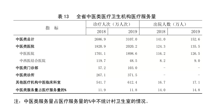(二)中医医疗服务。2019年,全省中医类诊疗人次达3107.0万人次,比上年增加420.1万人次(增长15.6%)。其中:中医类医院2020.2万人次(占65.0%),中医类门诊部及诊所474.5万人次(占15.3%),其他医疗机构中医类临床科室612.4万人次(占19.7%)。