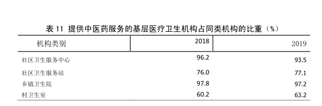 2019年末,提供中医服务的社区卫生服务中心占同类机构的93.5%,社区卫生服务站占77.1%,乡镇卫生院占97.2%,村卫生室占63.2%(见表11)。