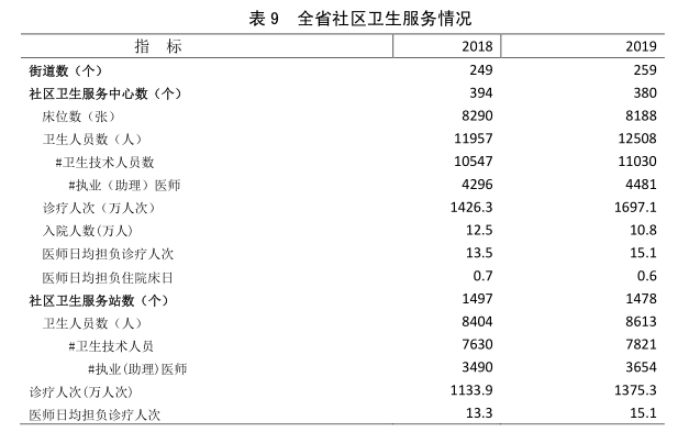 2019年,全省社区卫生服务中心诊疗人次1697.1万人次,入院人数10.8万人;平均每个中心年诊疗量4.5万人次,年入院量284人;医师日均担负诊疗15.1人次和住院0.6床日。2019 年,全省社区卫生服务站诊疗人次1375.3万人次,平均每站年诊疗量9305人次,医师日均担负诊疗15.1人次(见表9)。