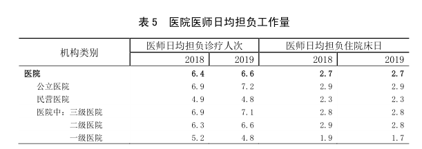 (二)医院医师工作负荷。2019年,全省医院医师日均担负诊疗6.6人次和住院2.7床日,其中:公立医院医师日均担负诊疗7.2人次和住院2.9床日。医院医师日均担负门诊工作量比上年增加;住院工作量与上年基本持平(见表5)。