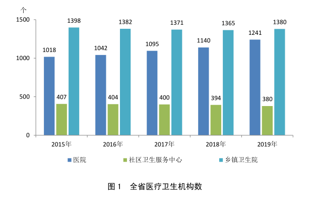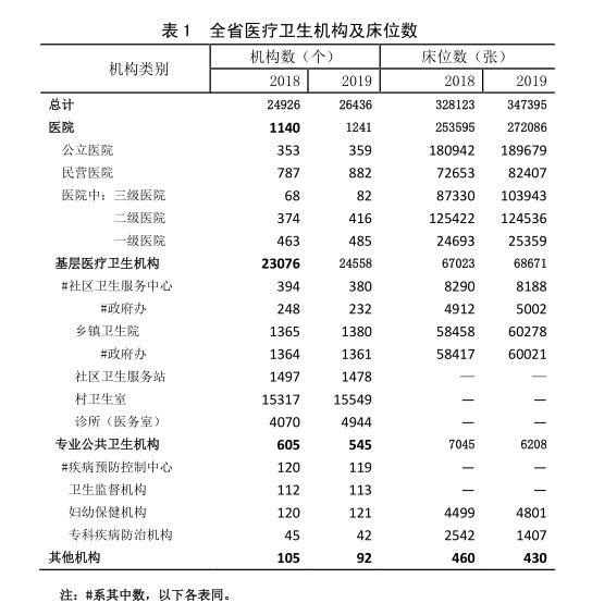 (一)医疗卫生机构总数。2019年末,全省医疗卫生机构数达26436个,比上年增加1510个。其中:医院1241个,基层医疗卫生机构24558个,专业公共卫生机构545个。与上年相比,医院增加101个 ,基层医疗卫生机构增加1482个(见表1)。