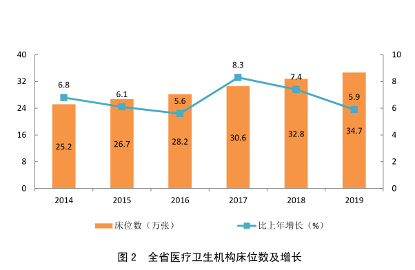 (二)床位数。2019年末,全省医疗卫生机构床位34.7万张,其中:医院27.2万张(占78.3%),基层医疗卫生机构6.9万张(占19.8%)。医院中,公立医院床位占69.7%,民营医院床位占30.3%。与上年比较,全省床位共增加1.9万张(增长5.9%),其中:医院床位增加1.8万张,基层医疗卫生机构床位增加0.17万张。每千人口医疗卫生机构床位数由2018年5.19张增加到2019年5.46张,但仍低于同期全国平均水平。