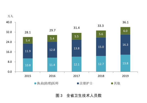 2019年末卫生人员总数中,卫生技术人员36.1万人,乡村医生和卫生员3.5万人,其他技术人员1.8万人,管理人员1.7万人,工勤技能人员2.4万人。卫生技术人员中,执业(助理)医师13.8万人,注册护士16.3万人。与上年比较,卫生技术人员增加2.8万人(增长8.3%) (见表2)。